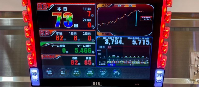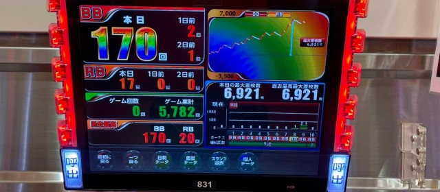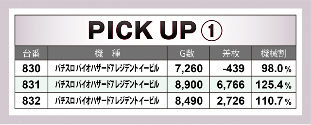 またこの日は横並びで3機種の好況スポットが出現。『押忍!番長ZERO』で+5千枚達成台、さらには『パチスロ バイオハザード7 レジデント イービル』で+7千枚弱の台が好調に出玉を刻んだ。