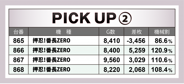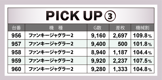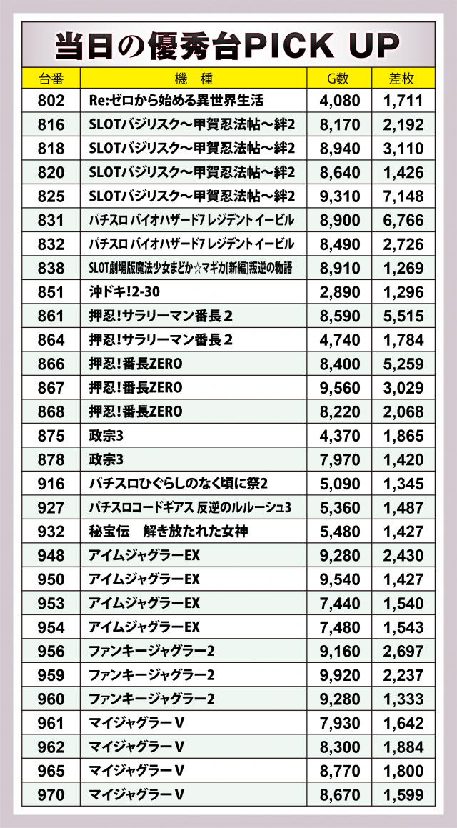 まずは優秀30台のPICK UPからチェック。後述する横並び好況スポット以外ではなんといっても『SLOTバジリスク~甲賀忍法帖~絆2』。横並び好況の対象でないものの複数の台が好成績で、プラス4台の合計差枚数は+1万4千枚弱に! その他でもドル箱使用台が数多く見られた。