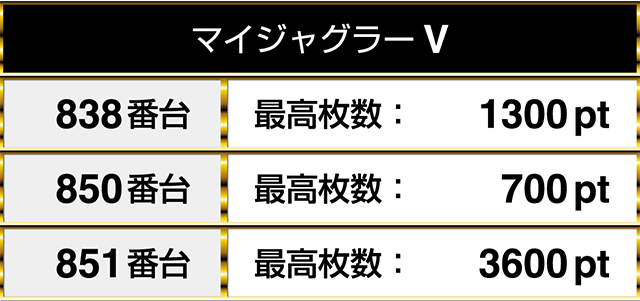 『マイジャグラーV』の3台が並んでプラスptを記録し、そのうちの1台は3000ptオーバー!!