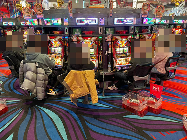 15時頃のパチスロは、沖スロを中心に華やかな光景が広がっていた。