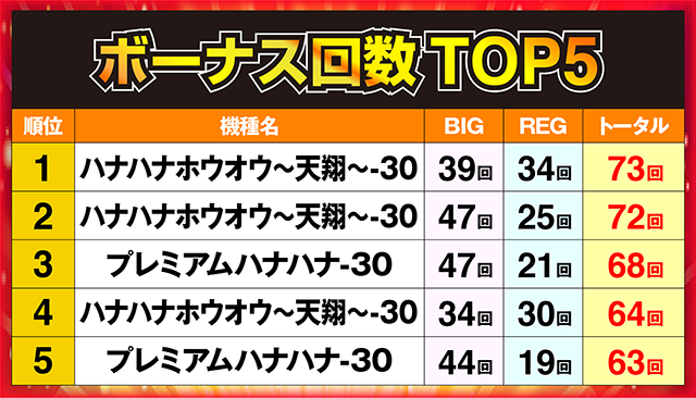 ボーナス回数が70回を超えた「ハナハナホウオウ~天翔~-30」が1位と2位にランクイン!