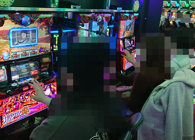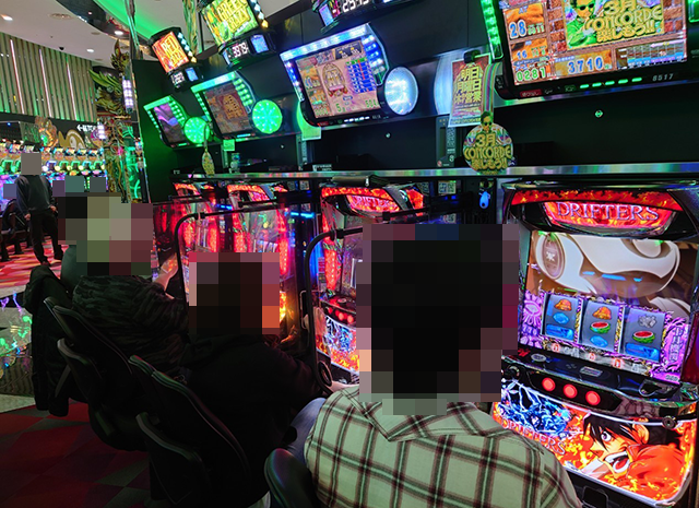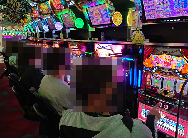 楽しげなプレイヤーが並ぶ『SLOTバジリスク~甲賀忍法帖~絆2』も大にぎわい!