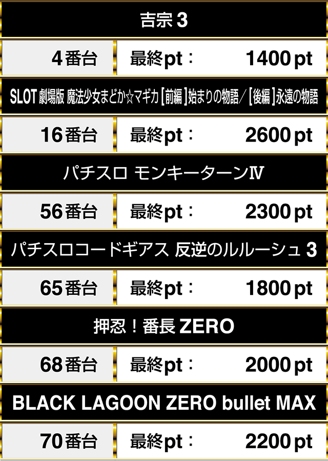 『パチスロ モンキーターンⅣ』の56番台や68番台の『押忍!番長ZERO』も2000pt以上を記録した。
