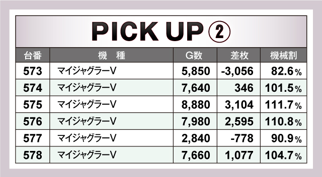 ピックアップ機種では、『SLOTバジリスク〜甲賀忍法帖〜絆2』、『マイジャグラーⅤ』が盛り上がりを見せていた。