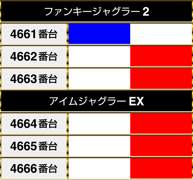 『ファンキージャグラー2』の2台は『アイムジャグラーEX』の3台と並んでプラスptとなった。