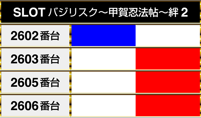 『SLOTバジリスク~甲賀忍法帖~絆2』の3台が並んでプラスptを記録!
