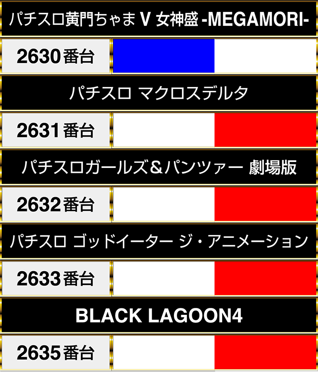 バラエティコーナーでは、2631番台の『パチスロ マクロスデルタ』から2635番台の『BLACK LAGOON4』までが並んでプラスpt!