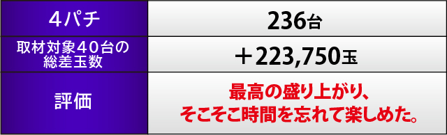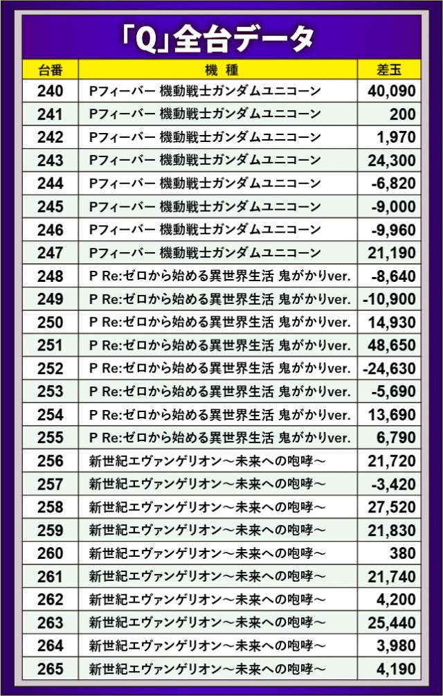 パチンココーナーでは『Pフィーバー 機動戦士ガンダムユニコーン』『新世紀エヴァンゲリオン〜未来への咆哮〜』の両巨頭が好パフォーマンスを披露。2万発オーバー台が続出する状況となり、各所でファンファーレが鳴り響いていたはずだ。また現役屈指の性能を誇る『P Re:ゼロから始める異世界生活 鬼がかりver.』も見逃せない。251番台の+46,650玉という凄まじい熱気が放たれ、全体を見ても7割近い台がプラス差玉を記録する息を吞むような光景が広がっていた。