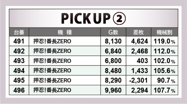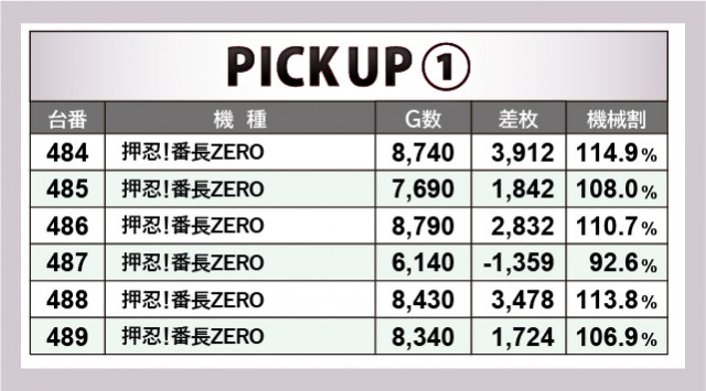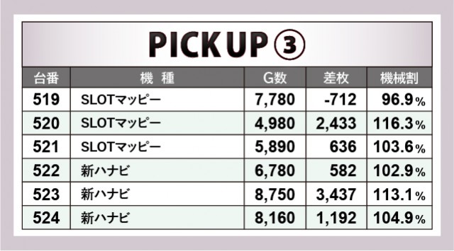『押忍!番長ZERO』は各台がしっかりと結果を残している。3~4千枚OVERが複数確認できるばかりか、しっかりとゲーム数が回された形跡もあり、ファンは相当な手ごたえを感じていたはずだ。またノーマルタイプからは『SLOTマッピー』『新ハナビ』に注目したい。後者は全台プラス差枚という素晴らしい結果となり、館内の盛り上がりを底上げしてくれたに違いない。