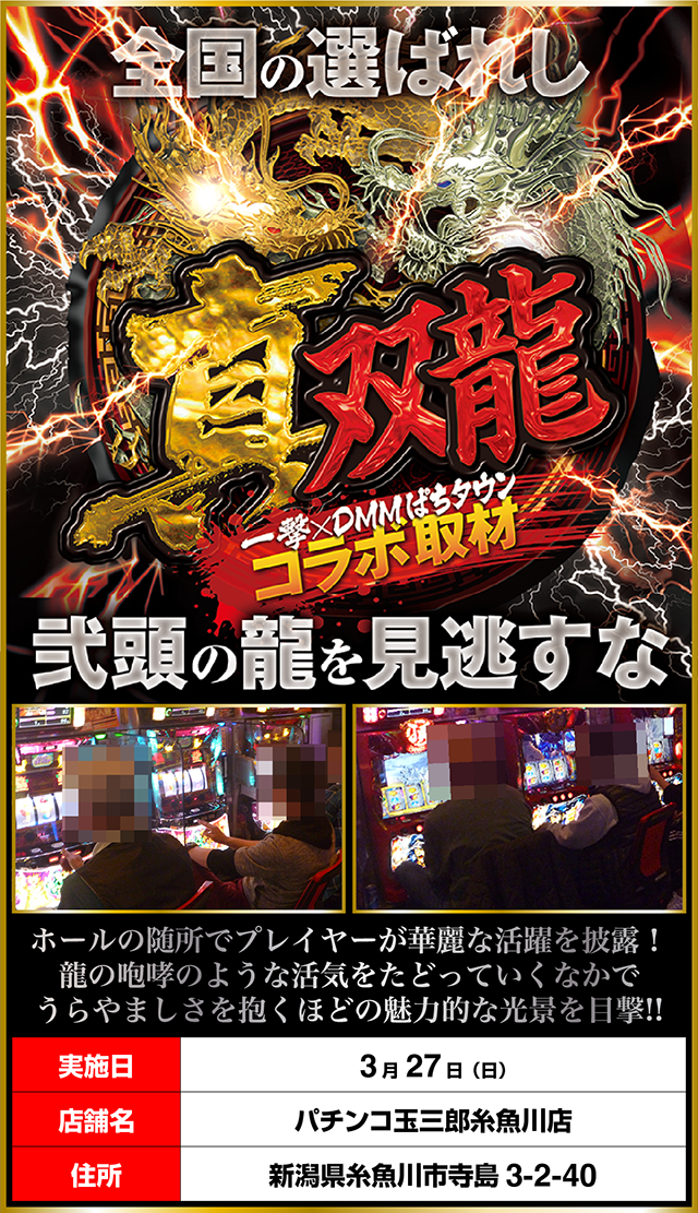 多くのプレイヤーが集まる「パチンコ玉三郎糸魚川店」にて、「真双龍」を実施。