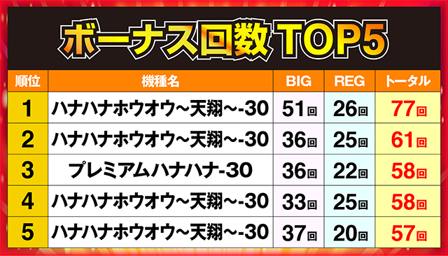 「ハナハナホウオウ~天翔~-30」からは4台がTOP5入りをはたし、ボーナス回数77回を記録した台が堂々のトップ!