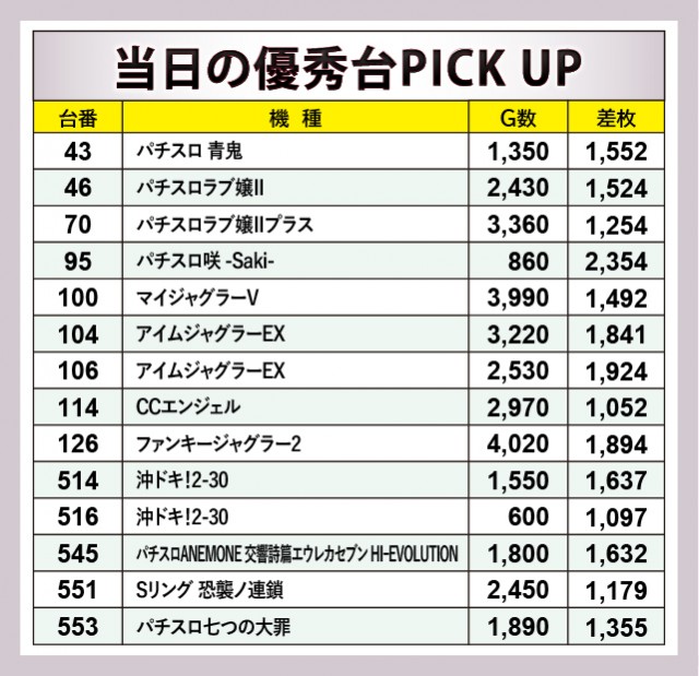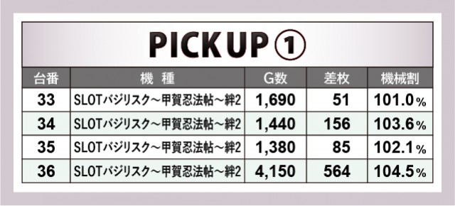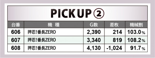 多くのファンを魅了する『SLOTバジリスク~甲賀忍法帖~絆2』では、全台プラス差枚数を記録。また『押忍!番長ZERO』でも3分の2台がプラスとなり、しっかりと結果を残している。突出した数字こそ見られないが、両機種とも全国を席巻する人気機種であるため、回転数を重ねるにつれて好感触を得られたに違いない。