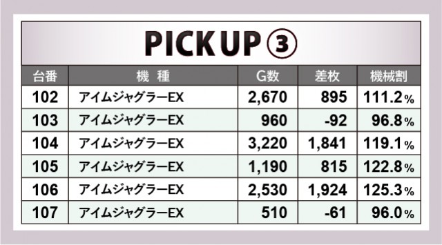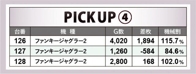 またノーマル機を盛り上げてくれたのは『アイムジャグラーEX』と言えよう。2千枚OVERに迫る勢いを披露しており、連チャンボーナスに心躍る展開だったのではと想像してしまう。『ファンキージャグラー2』も同様で、こちらも総回転数が増えていくにつれて、優秀台であることを確信したに違いない。