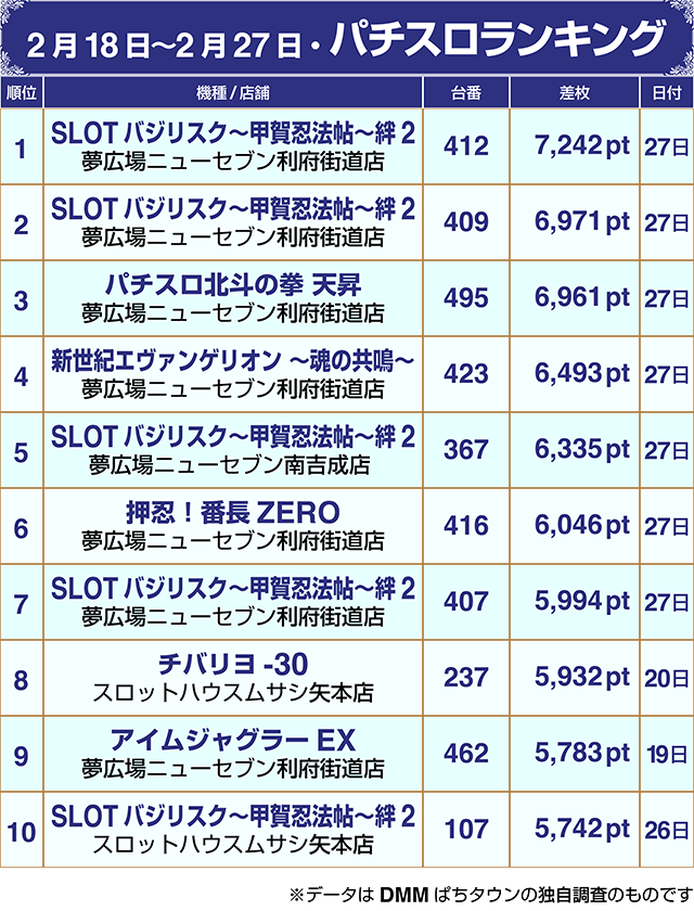 【パチスロ2月18日~2月27日ランキング】