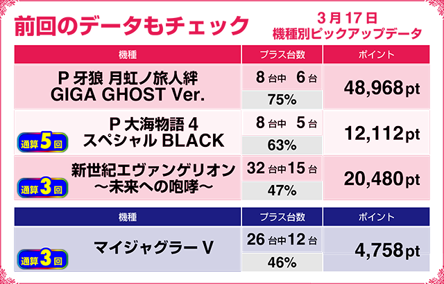 ピックアップだけでなく、ランキングにも魅力的なデータがズラリ。パチンコはすべて+50,000pt超、パチスロもすべて+5,000pt超といった結果を残した。