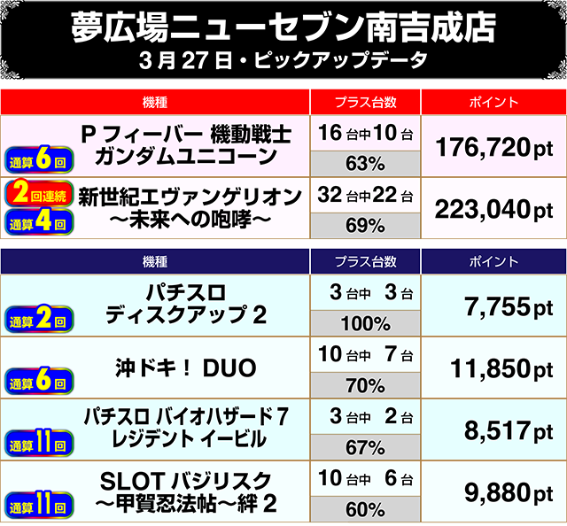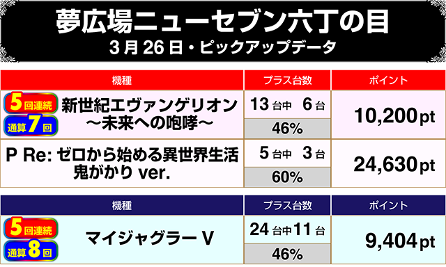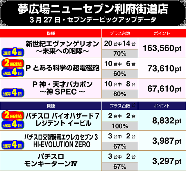 パチンコでもっとも設置台数の多い『新世紀エヴァンゲリオン~未来への咆哮~』も目立ち、トータル差枚数は+160,000ptを超えた。