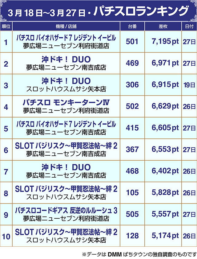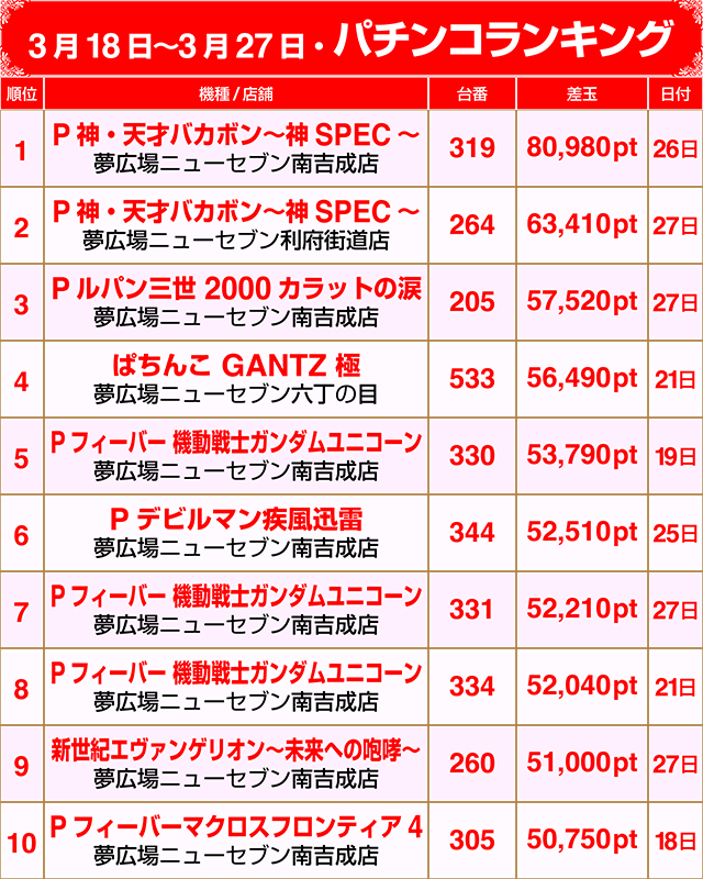 【パチンコ3月18日~3月27日ランキング】