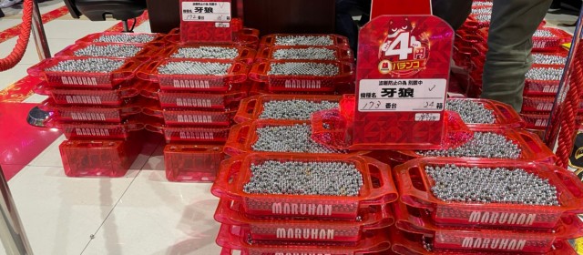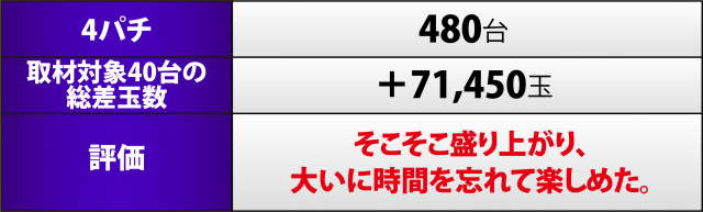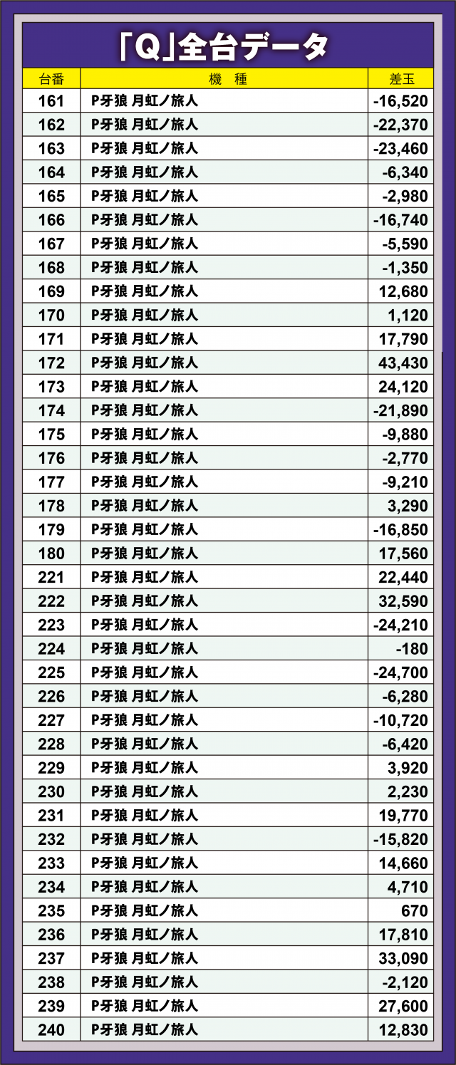 続いてはQが参戦した4パチをチェック。当日の取材対象は『P牙狼 月虹ノ旅人』計40台で、差玉+4万発超えが1台&+3万発が2台出る中、トータルで+7万発を突破。また、ファンの多くが笑顔で通常時回転をこなしていたのも印象的だった。