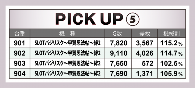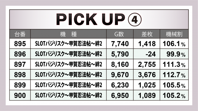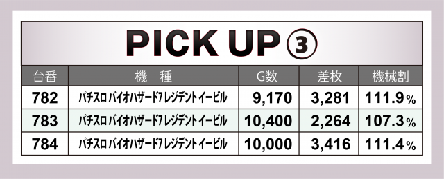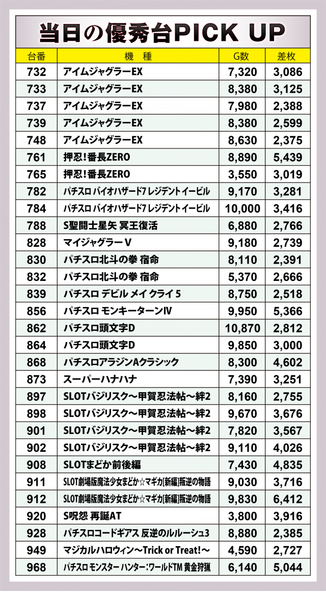 またこの日は6機種計27台の横並び好況スポットが出現。3台以外は全てプラス、どの機種も高水準のスコアとなった。特に10台で+2万枚弱を叩き出した『SLOTバジリスク~甲賀忍法帖~絆2』、3台で+9千枚弱を刻んだ『パチスロ バイオハザード7 レジデント イービル』が目立っていた。