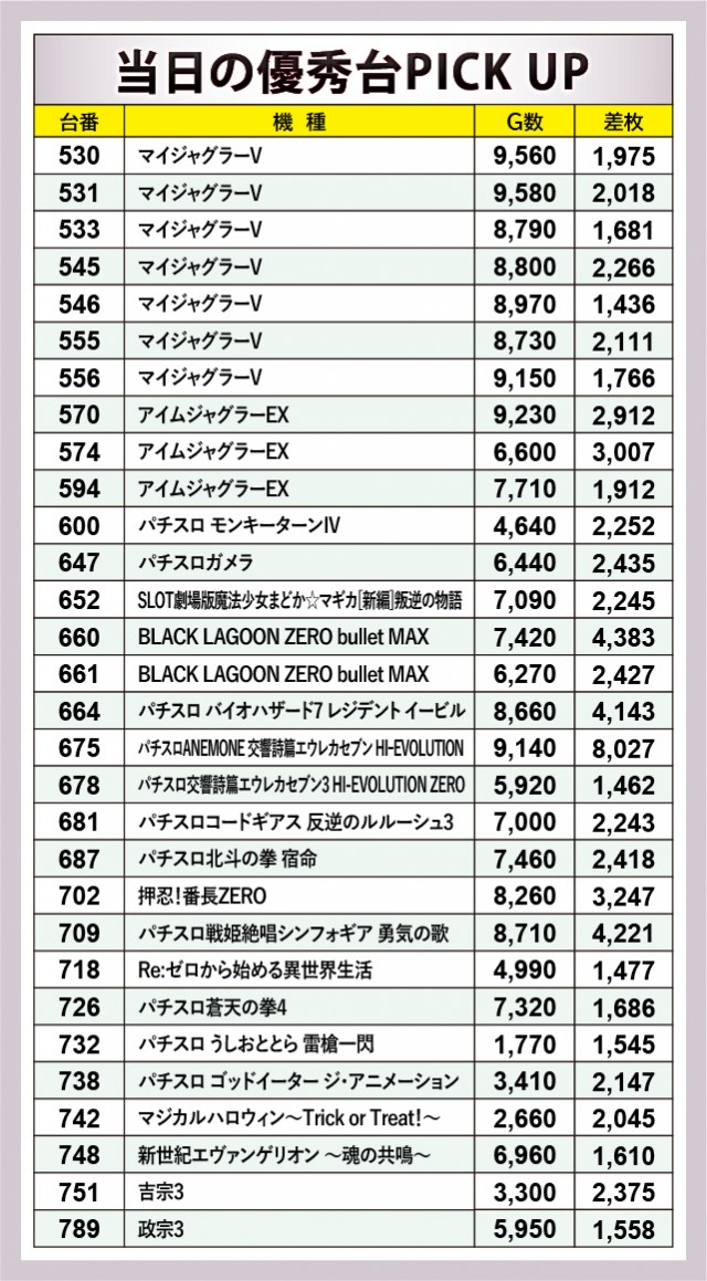 総差枚数で大きくマイナスとなってしまったが、ポテンシャルをくみ取れる内容だったのは間違いない。朝イチから『ジャグラー』の島が満席になるなど、通い詰めているファンは同店の実力をしっかりと理解していることも窺える。しかし総差枚数がプラスとなれば、より実力が明確になるというもの。次回こそは勝利を掴み取り、同店の力を明白のものとしてほしいばかりだ。