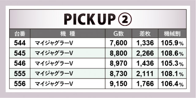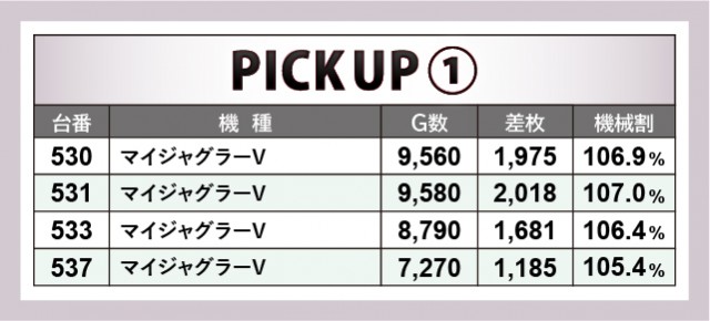 特に目立っていたのは『マイジャグラーV』だった。朝からフル稼働で賑わう状況となり、誰もが期待している一角だったのは間違いない。差枚でも2千枚OVERが見られる結果となり、打ちすすめていくにつれて期待が確信へと変わっていったことだろう。他の『ジャグラー』シリーズも同様で、ノーマル機群を牽引する存在だったのも付け加えておきたい。