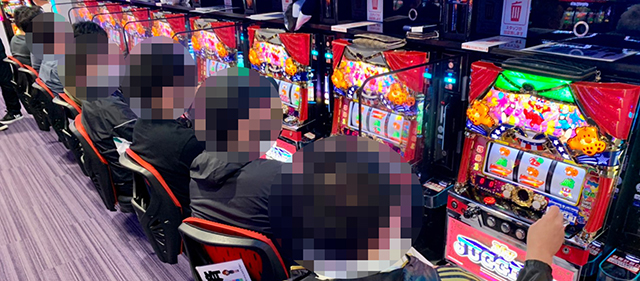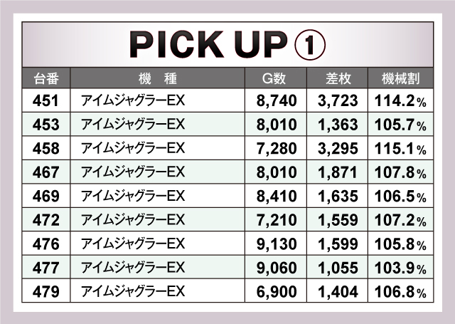 当日、特に目立った活躍を見せていたのが、同店自慢の『ジャグラーコーナー』。中でも『アイムジャグラーEX』と『マイジャグラーV』は絶好調の様子で、『アイジャグ』の451番台と458番台、『マイジャグV』の647番台はプラス3千枚オーバーと、レバーを叩くファンも大満足の様子だった。