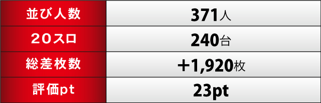 優秀台、ピックアップ機種ともに好調ということもあって、トータルの差枚は+1,920枚を記録。枚数だけ見ると少なく見えるが、評価ptが23ptを獲得しているように、お客さんの満足度は高かった。今後も期待できる。