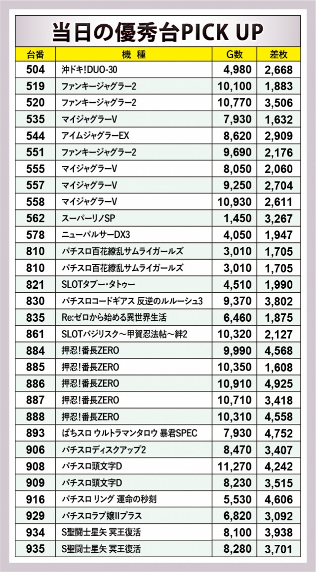 定番の『ジャグラー』シリーズや『押忍!番長ZERO』など、人気の高い機種群の名前が多く連なっているのが印象的だ。その中で『SLOTバジリスク~甲賀忍法帖~絆2』『パチスロ頭文字D』といった高い支持を集める機種の名前も目立ち、各所でドル箱に手を伸ばす光景が見られた。最新機種『ぱちスロ ウルトラマンタロウ 暴君SPEC』も優秀台としてピックアップされるなど、多くのファンが手ごたえを感じられたのではないだろうか。