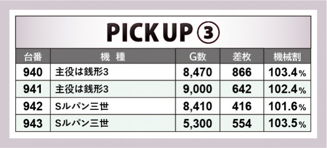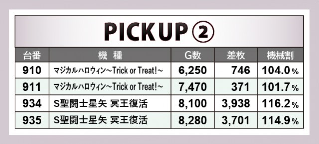 そして特筆しておきたいのが、2台構成の機種に当たりが目立っていた点だ。『マジカルハロウィン〜Trick or Treat!〜』『S聖闘士星矢 冥王復活』『主役は銭形3』『Sルパン三世』の4機種はいずれもプラス差枚で終えており、いずれもしっかりと回転数が稼がれている。『S聖闘士星矢 冥王復活』は4千枚近い差枚数となり、こちらでも晴れやかな笑顔を覗かせるファンの姿が想像にたやすい。