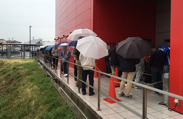 朝イチはパチンコとパチスロで別々に並んだ順番での入場となっており、この日は両方を合わせて100名以上のプレイヤーが集まっていた。