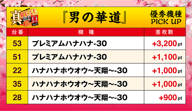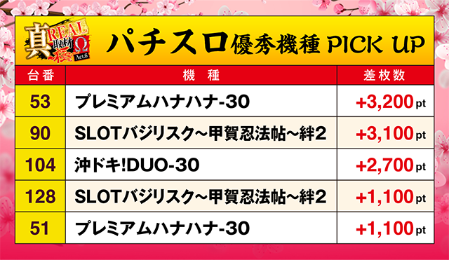 「ハナハナホウオウ~天翔~-30」は2台が+1,000ptを記録した。