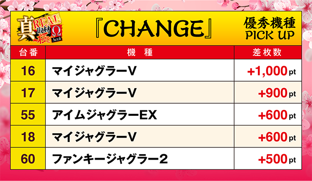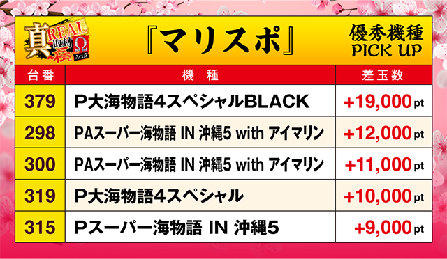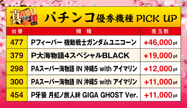 +19,000ptを記録した「P大海物語4スペシャルBLACK」を筆頭に、4台が+10,000pt以上となった。