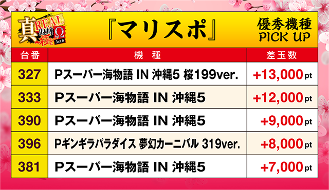 「Pスーパー海物語 IN 沖縄5 桜199ver.」と「Pスーパー海物語 IN 沖縄5」で、+12,000pt以上のデータを確認!