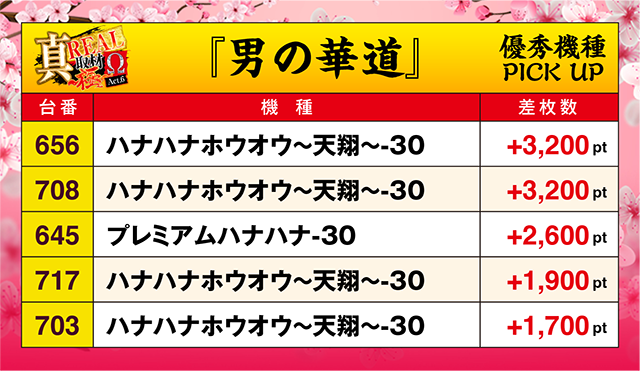 「ハナハナホウオウ~天翔~-30」の656番台と708番台は、+3,000ptを上回った。