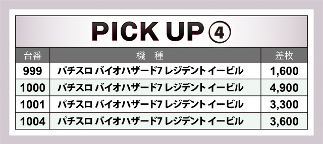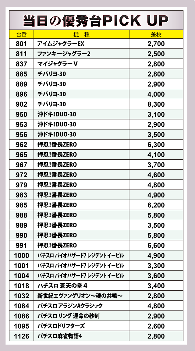 また当日は4機種に好調台が連発。先述した『番長ZERO』はもとより、『チバリヨ-30』に+8千枚超、『パチスロ バイオハザード7 レジデント イービル』に+4千枚1台&+3千枚が2台!