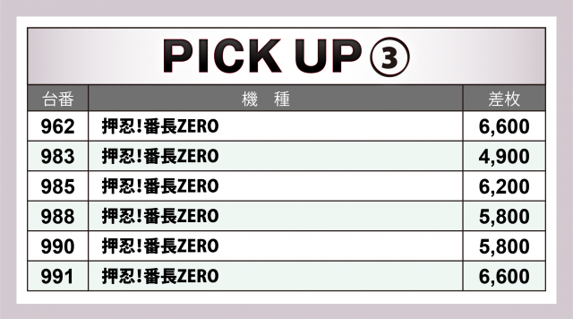 この日はなんといっても『押忍!番長ZERO』が大爆発。優秀30台のうち11台を占め、そのトータル差枚数は驚きの+5万6千枚超! また後述する4機種以外では『パチスロ アラジンAクラシック』で+4千枚突破、『沖ドキ!DUO-30』『パチスロ 蒼天の拳4』で+3千枚クラス複数となった。