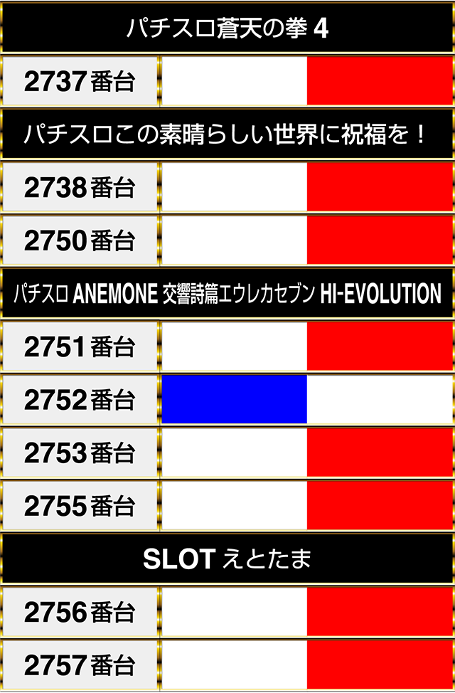 閉店時には2737番台から2751番台までと2753番台から2757番台までにプラスptが並んだ。