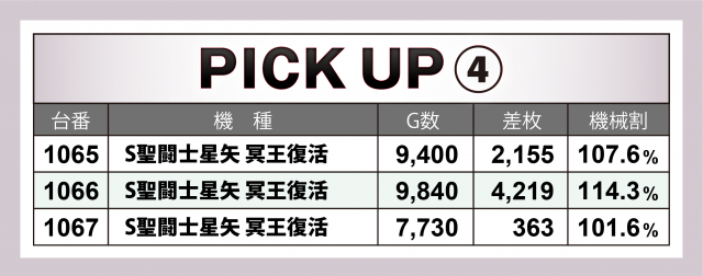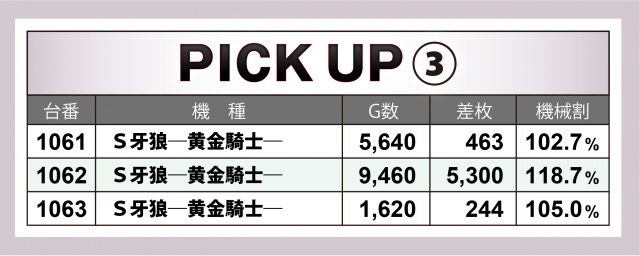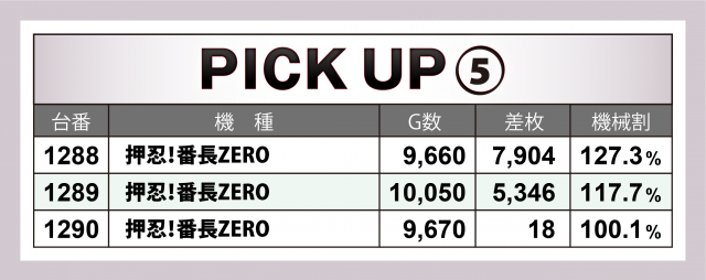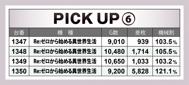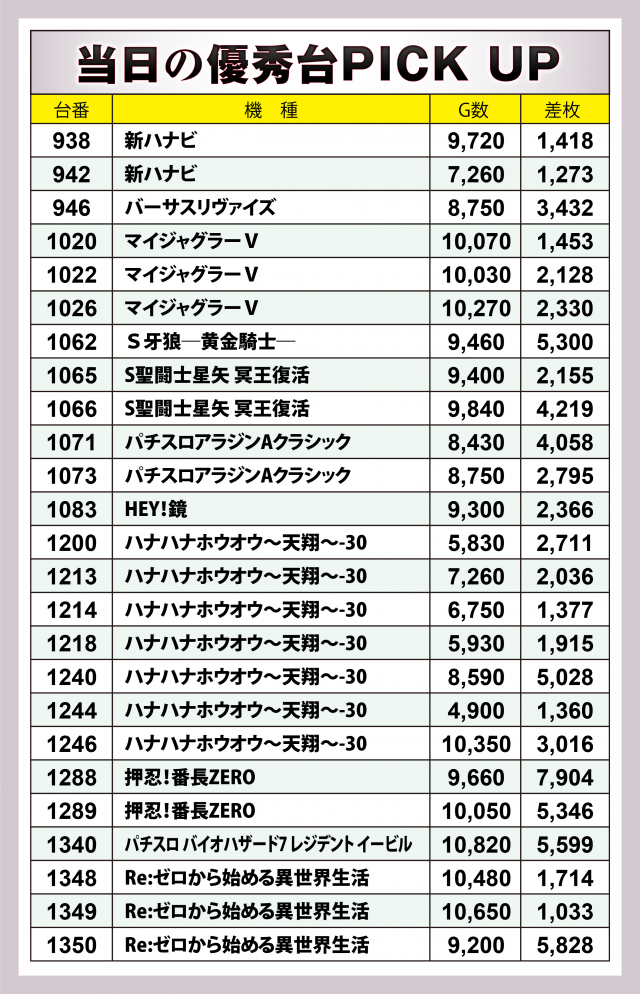 またこの日は6機種21台の横並び好況スポットが出現。対象全てがプラス台、特に好調だったのが『押忍!番長ZERO』で、3台トータルで+1万2千枚突破の好記録! さらに『Re:ゼロから始める異世界生活』で+6千枚弱、『S牙狼―黄金騎士―』で+5千枚超え、『S聖闘士星矢 冥王復活』で+4千枚オーバー!