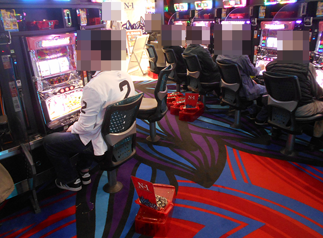 持ち玉で遊技を楽しむ姿が多数。14時過ぎの時点で、6箱以上となっている姿もあった。