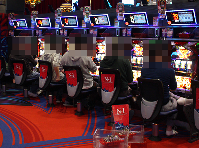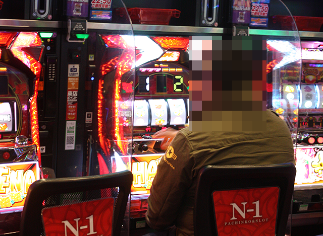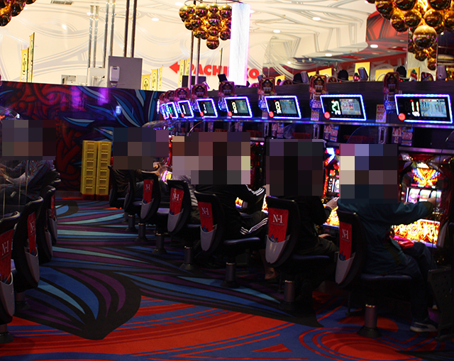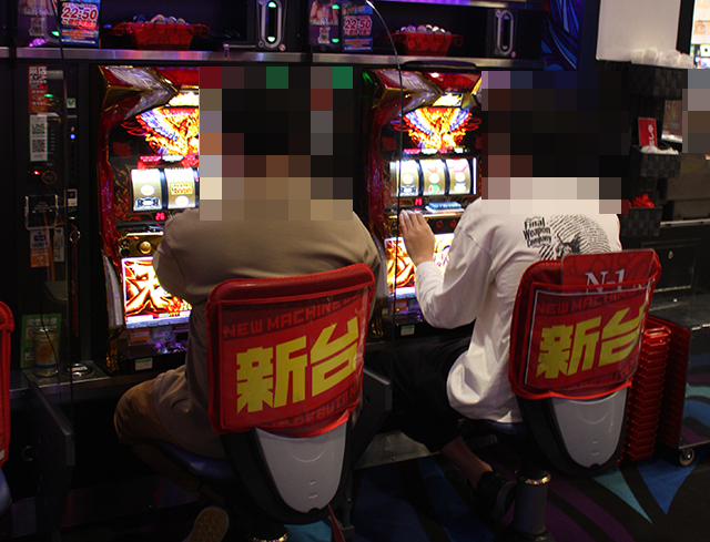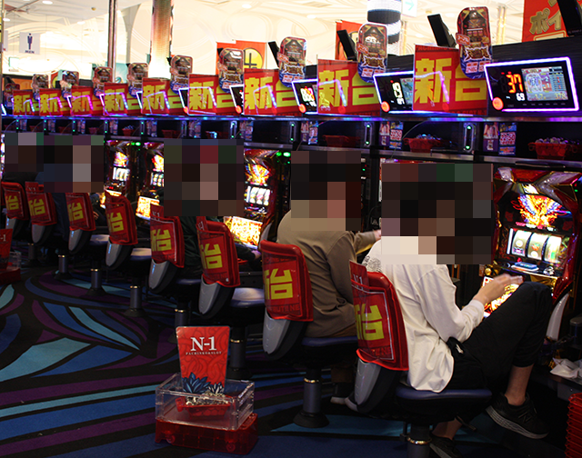 さまざまな機種が並ぶパチスロにおいて、抜群の存在感を放っていたのが「ハナハナホウオウ~天翔~-30」。47台が設置されており、夕方頃は半数ほどの台が埋まっていた。