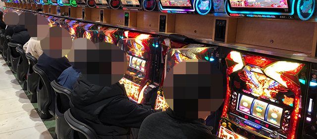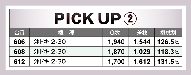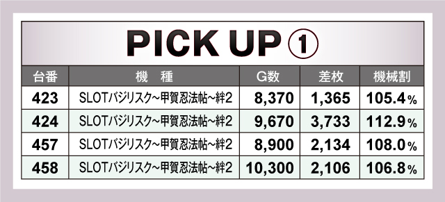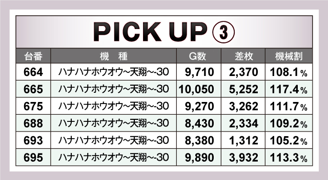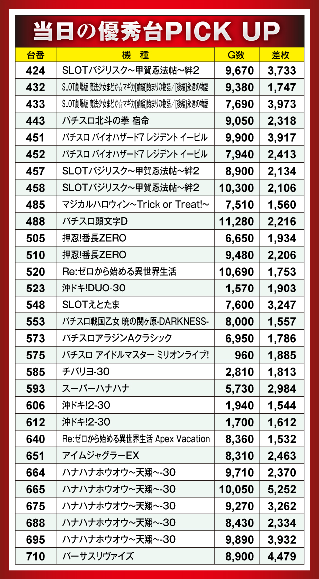 アップが降臨したパチスロコーナーをチェックしてみると、差枚3千枚以上のプラスを記録した台がゴロゴロと転がっていた。『バジリスク絆2』、『魔法少女まどか☆マギカ前後編』、『バイオハザード7』、『SLOTえとたま』、『バーサスリヴァイズ』といった人気機種から最新機種まで、様々な機種が絶好調。特に『ハナハナホウオウ〜天翔〜-30』はコーナー全体で優秀な成績となり、665番台の5千枚オーバーを筆頭に、多くの優秀台が生まれていた。
