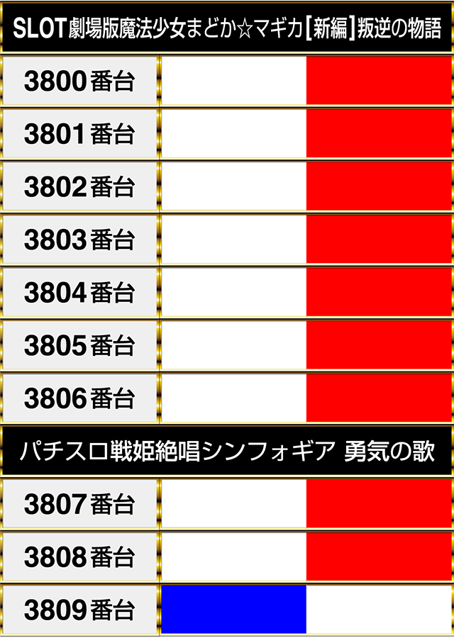 となりにある『パチスロ戦姫絶唱シンフォギア 勇気の歌』の2台をあわせると、3800番台から3808番台までが並んでプラスpt!!