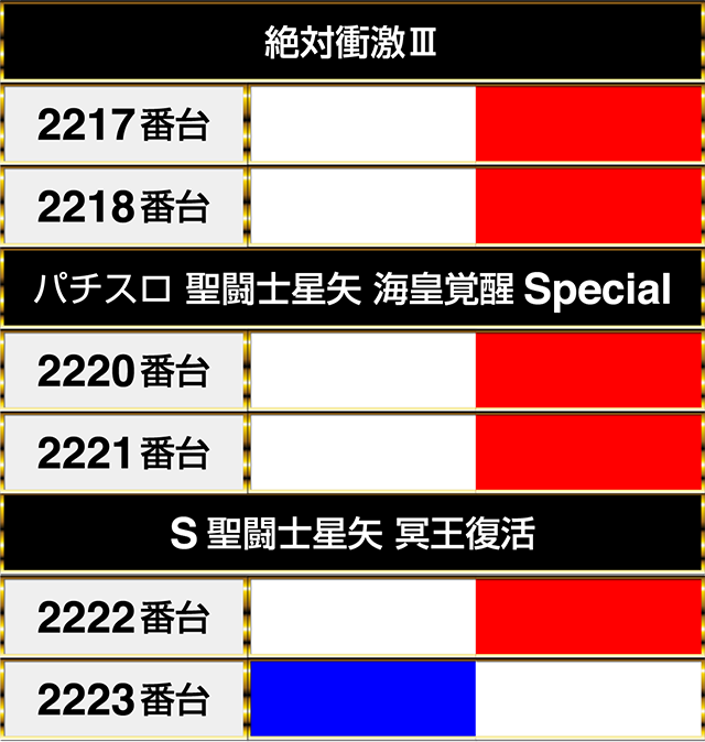 並びで設置された『パチスロ 聖闘士星矢 海皇覚醒Special』と『S聖闘士星矢 冥王復活』をあわせると、2217番台から2222番台までが連なってプラスptとなった。