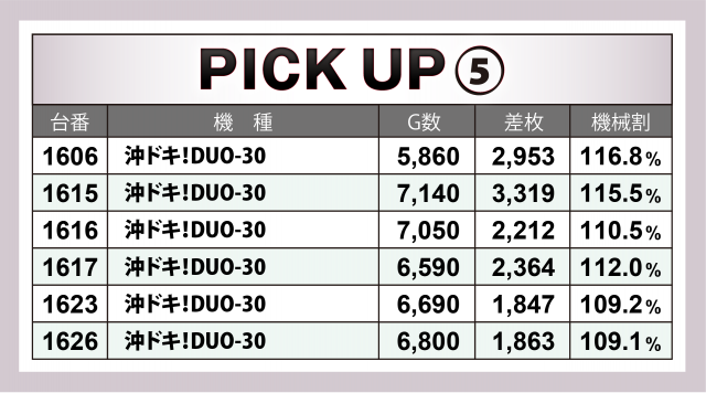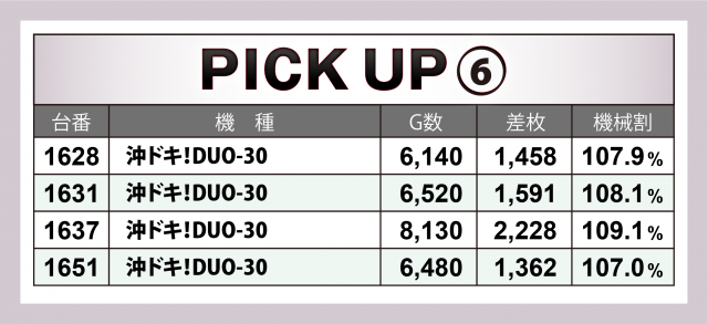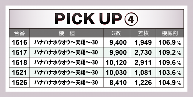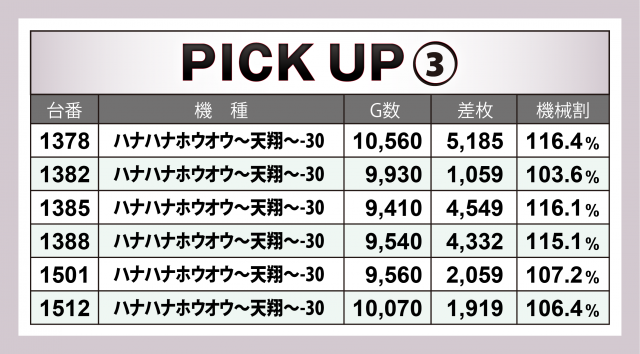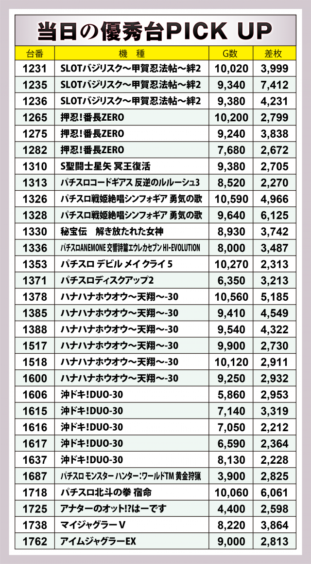 最初はこの日の優秀30台からチェック。30台全てが差枚数+2千枚以上となり、その半数となる15台が+3千枚以上の好記録。後述する好調4機種以外では、+6千枚を突破した『パチスロ北斗の拳 宿命』を筆頭に、プラス3台のトータルが+9千枚を超えた『押忍!番長ZERO』、稼働良好&ボーナス表示の多さが目に付いた『マイジャグラーⅤ』の出玉が光った。