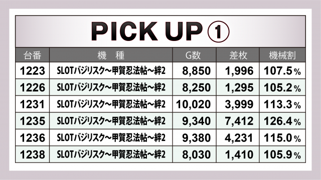 続いてはこの日の好調4機種に注目。まずは『SLOTバジリスク~甲賀忍法帖~絆2』。+7千枚の台をトップに6台の合計は+2万枚オーバー! また同店では設置多数の30パイマシン『ハナハナホウオウ~天翔~-30』『沖ドキ!DUO-30』も好出玉、前者はプラス11台合算で+2万9千枚弱・後者はプラス10台トータルで+2万1千枚超え。さらに『パチスロ戦姫絶唱シンフォギア 勇気の歌』は3台と少数設置ながら全台プラス&合計+1万2千枚をもぎ取った!!
