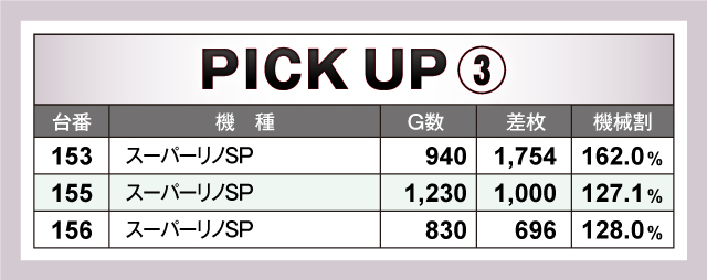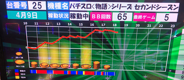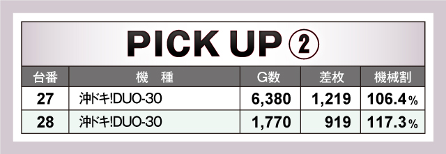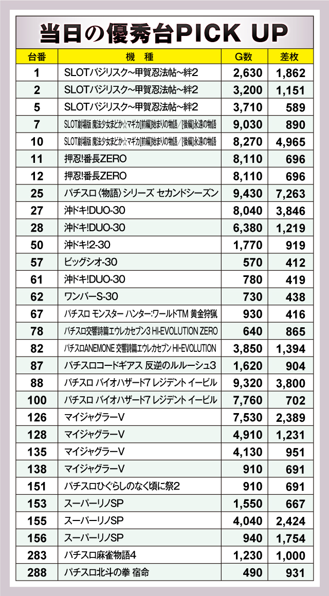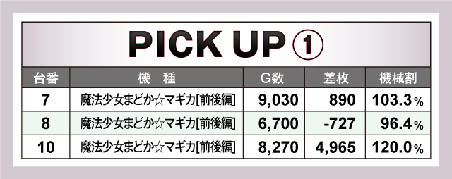 まずは当日の優秀台を厳選してみたのだが、かなり目立つプラス差枚を記録した機種が多く出現した。『シリーズセカンドシーズン』は7,000枚オーバー、『沖ドキ!DUO』や『バイオハザード7』は3,800枚のプラスと、好成績を残している。さらに、『まどか☆マギカ前後編』も3台合計で約5,000枚のプラス、『スーパーリノSP』も約4,800枚とこちらも素晴らしい結果となった。