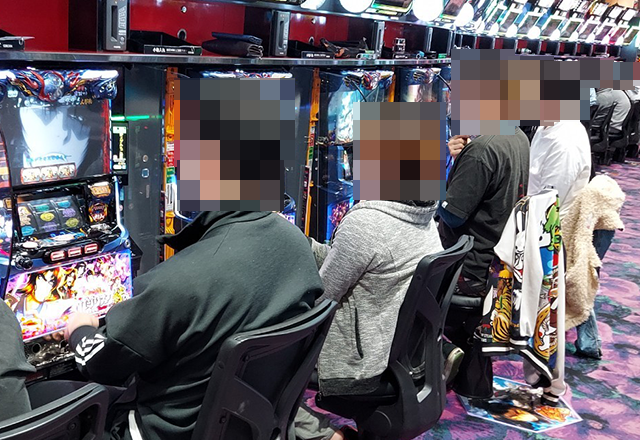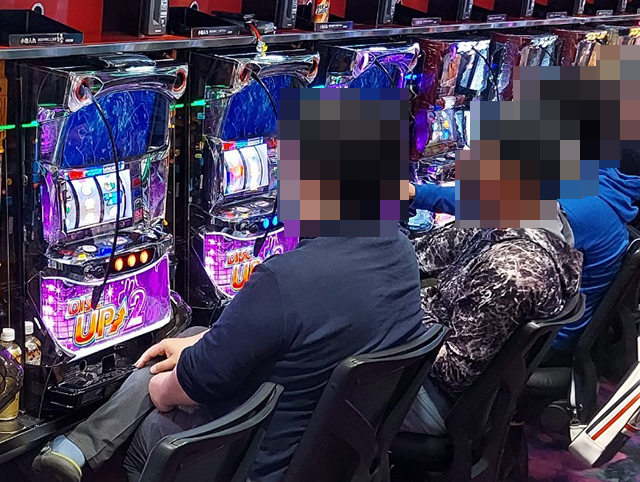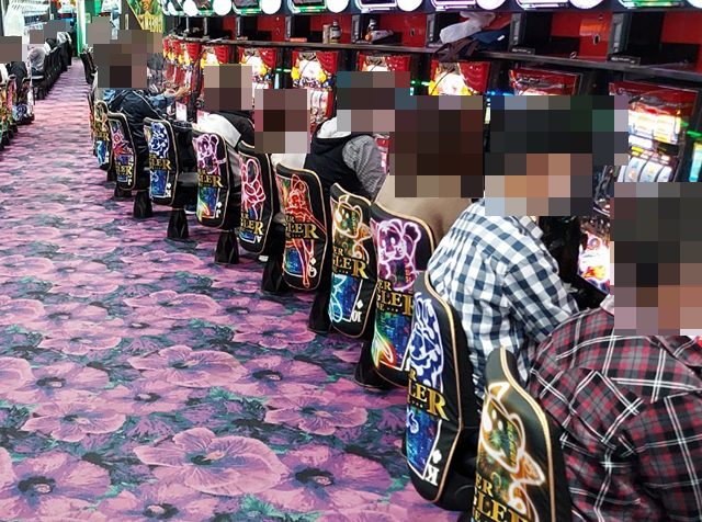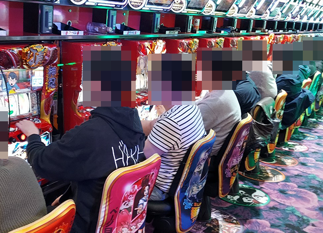 午後のパチスロは満席の機種が多く、あちこちに華やかな光景が広がっていた。