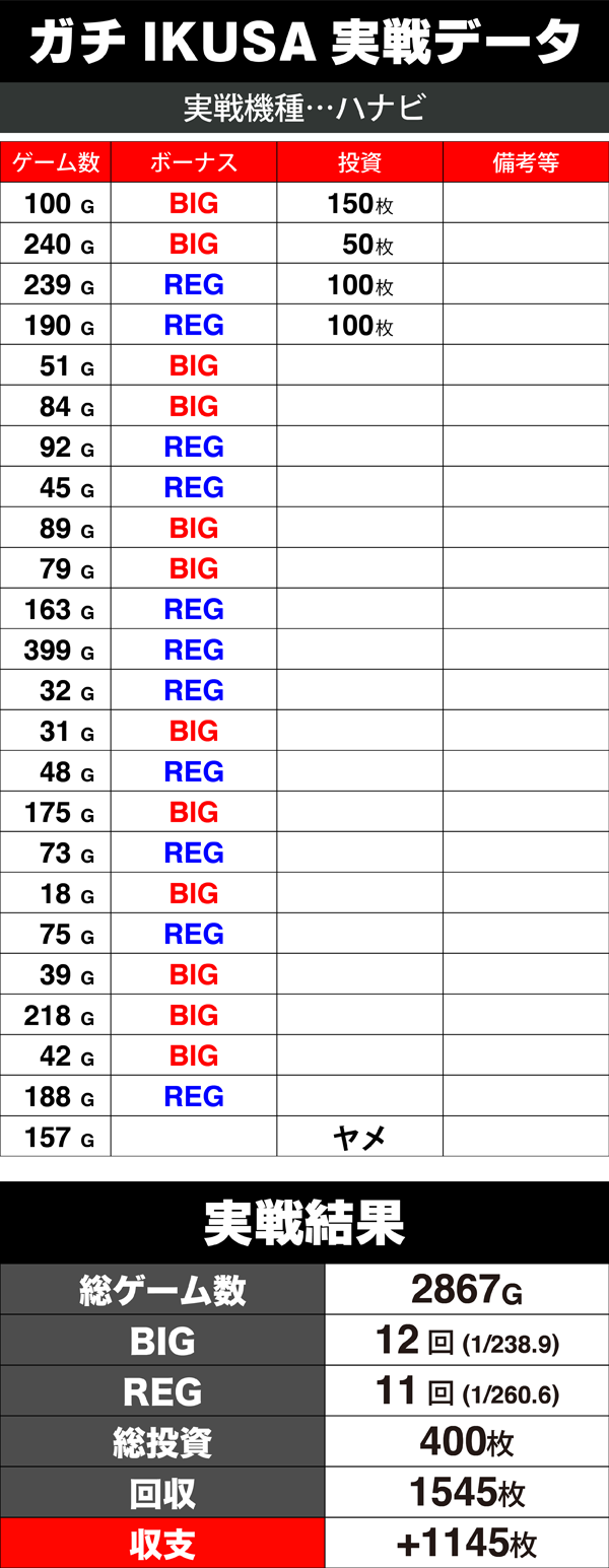 差枚がプラスになったということにくわえ、ボーナスの確率がすべて設定6以上と完璧な展開であった。