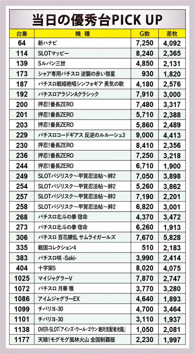 結果を振り返ると、4千枚OVERを達成した台が多数見られたのが印象的だ。最高記録となったのは『パチスロ 百花繚乱 サムライガールズ』306番台+5,828枚で、これに続いて『パチスロコードギアス 反逆のルルーシュ3』229番台+4,413枚、『新ハナビ』64番台+4,092枚となっている。メイン機種群の活躍も目立っており、館内各所にて熱気が高まっていき、全体の盛り上がりへと繋がっていったと想像できるだろう。