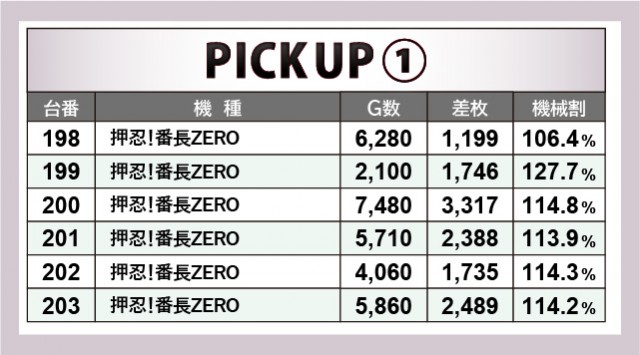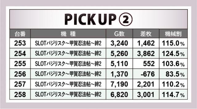 人気機種『押忍!番長ZERO』『SLOTバジリスク~甲賀忍法帖~絆2』について、より詳細に振り返っていこう。特徴的なのは6台横並びで好調さを見せる台が存在していた点で、こと『押忍!番長ZERO』に関しては、全台プラス差枚を記録している。『SLOTバジリスク~甲賀忍法帖~絆2』も負けじと好パフォーマンスを披露し、両台とも圧倒的な存在感を放っていたのは間違いない。
